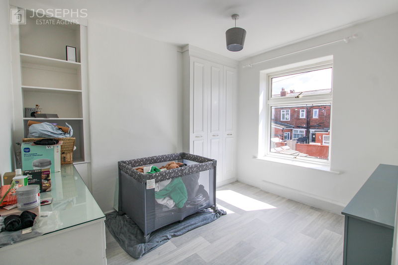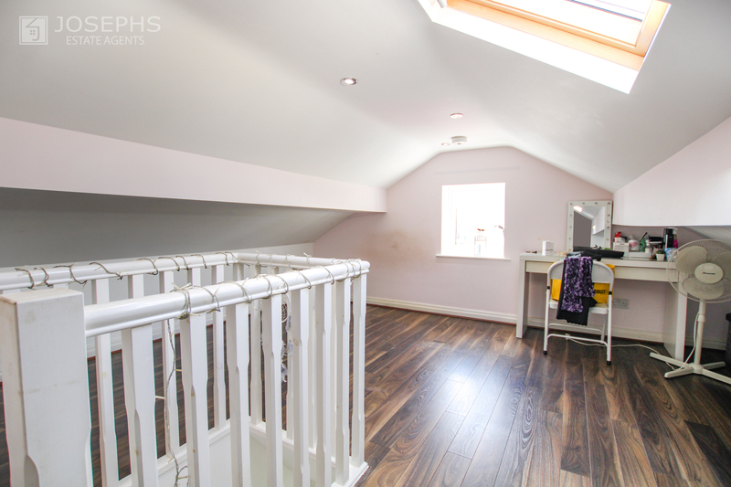 To the first floor, there are two generously sized bedrooms, including a master bedroom with fitted wardrobes, along with a well-appointed family bathroom. A further staircase leads to the converted attic, which has been purpose-built and is currently used as a third bedroom, offering versatile additional space.
